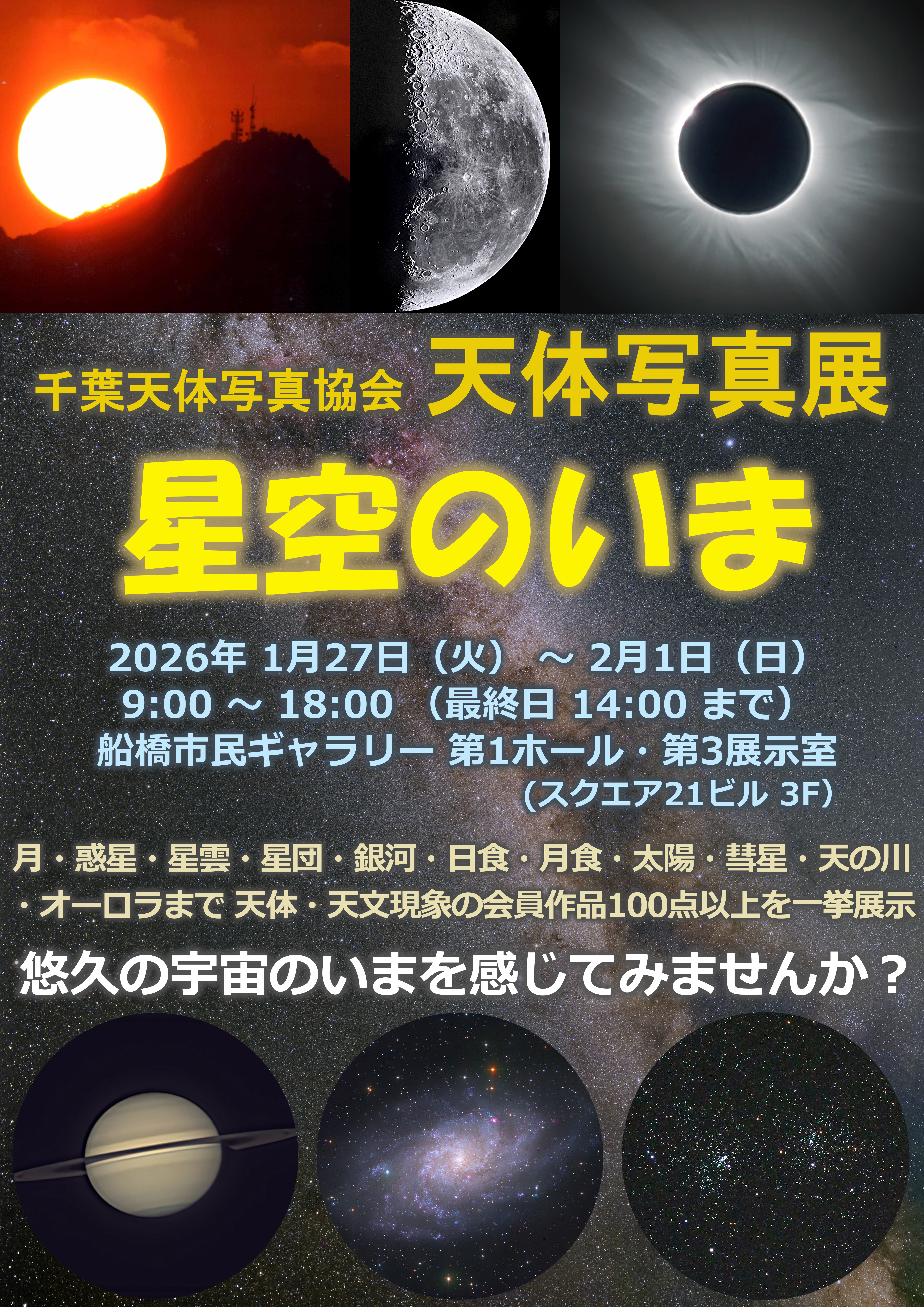 次回の千葉天体写真協会例会(総会): 2026年1月18日(日) 12時30分〜17時30分 (予約時間帯12:00〜18:00) 開催場所: 船橋市東部公民館 3階 第4集会室 JR津田沼駅から北に約300m、徒歩3分 周辺に有料駐車場があります(イオン駐車場から公民館まで300m) 年に一度の総会です。引き続き例会を開催し写真展についての最終打合せを行います。 天体写真展のご案内 2026年1月27日(火)〜2月1日(日) 船橋市民ギャラリーで天体写真展を開催します。 A1、A2サイズを中心に会員の力作を一挙に100点以上展示します。 冬の最も寒い時期の開催ですが、一見の価値があります。 千葉天体写真協会 天体写真展 −星空のいま− 場所:船橋スクエア21ビル 3階 船橋市民ギャラリー 第1ホール+第3展示室 船橋市民会館の東隣、JR船橋駅から南に徒歩5分です。 周辺地図 展示期間:1月27日(火)〜2月1日(日) 展示時間:9:00〜18:00(最終日2月1日は14:00まで) (1月26日に準備作業、2月1日 14:00から撤収作業の予定) 2025年度の例会は以下の日を予定しています。ただし、会場の確保状況により1週間前か後の日曜日に変更となる場合がありますのでご承知ください。 3月16日(日)、5月11日(日)、7月6日(日)、9月21日(日)、 11月9日(日)、(2026年)1月18日(日)、3月8日(日) |